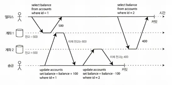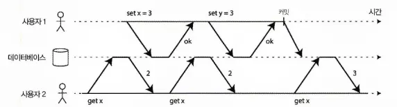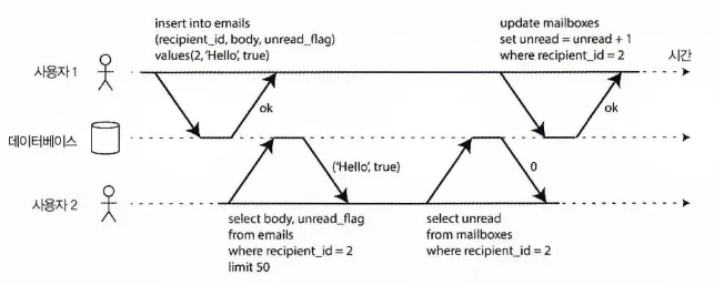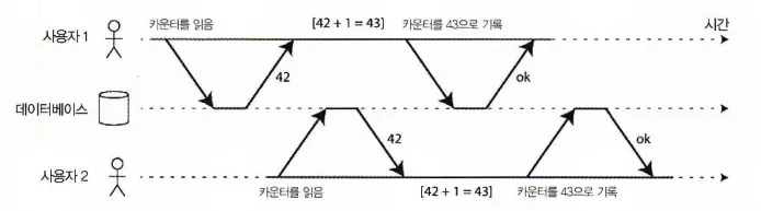 클라이언트들이 서로 DB의 다른 부분을 읽고 쓰면 문제가 되지 않지만, 동일한 DB 레코드에 접근하면 동시성 문제(경쟁 조건)에 맞닥뜨리게 된다. 다음 그림이 동시성 문제가 발생하는 상황이다.
