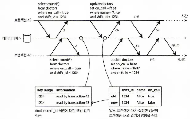 트랜잭션42, 트랜잭션43모두 대기 순번 1234 동안의 호출 대기 의사를 검사한다. shift_id에 색인이 있으면 DB가 색인 항목 1234를 사용해 트랜잭션42, 트랜잭션43이 이 데이터를 읽었다는 사실을 기록할 수 있다. (색인이 없으면 이 정보를 테이블 수준에서 추적할 수 있다. )
