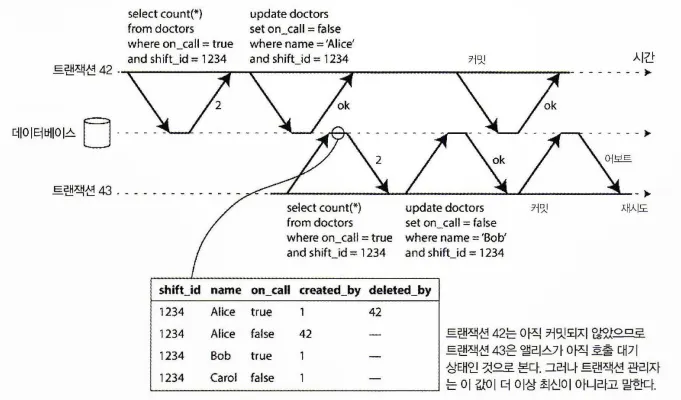 트랜잭션이 MVCC DB의 일관된 스냅숏에서 읽으면 스냅숏 생성 시점에 다른 트랜잭션이 썼지만 아직 커밋되지 않은 데이터는 무시한다. 다음 그림을 보면 트랜잭션 43은 앨리스가 on_call이 true 상태인 것으로 보게 된다.