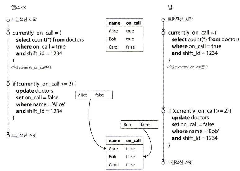 트랜잭션이 무언가를 읽고 읽은 값을 기반으로 어떤 결정을 하고 그 결정을 DB에 쓴다.