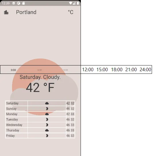날씨앱은 화면을 가상의 8개의 행으로 구분한다. 위 이미지에 나와있는 시간(3:00~24:00)과 동일하다. 그래서 최상단은 3:00시를 가리키고 최하단은 오후 24:00시를 가리킨다.