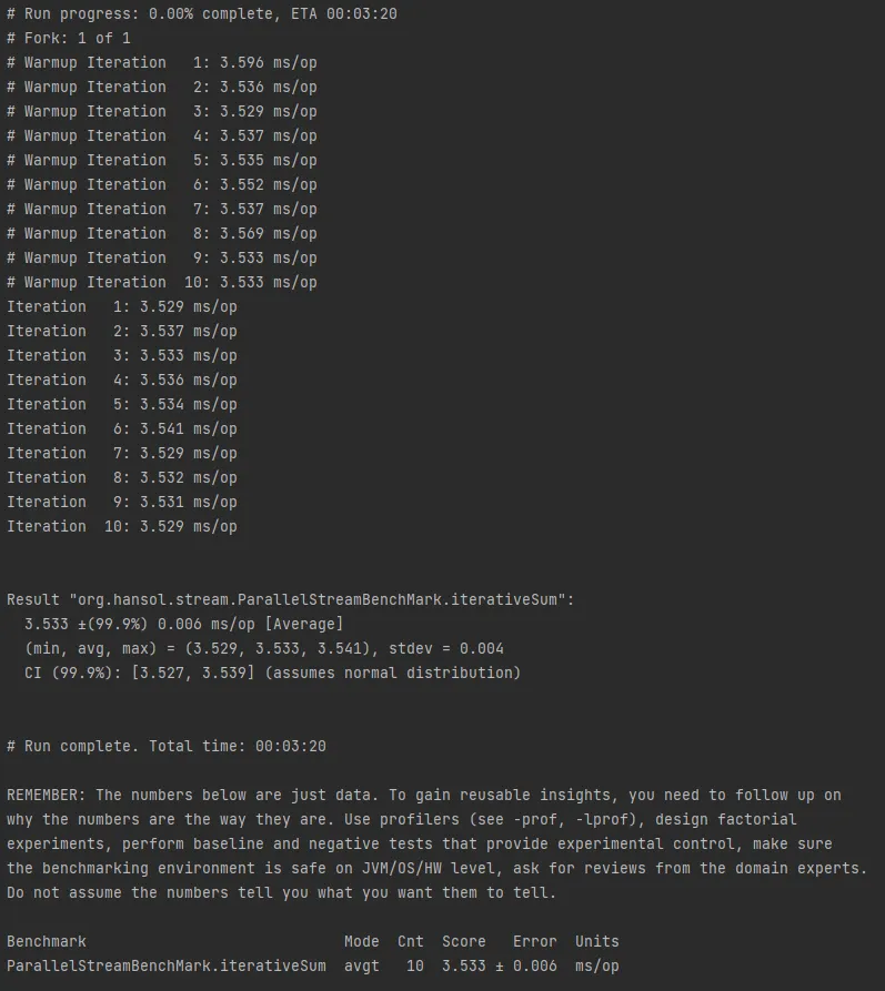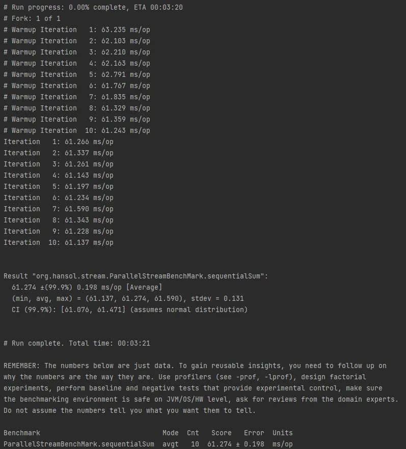 여기서 벤치마크 대상 메서드를 반복문, 순차 리듀싱, 병렬 리듀싱 순으로 체크해보면 결과는 다음과 같이 나온다.