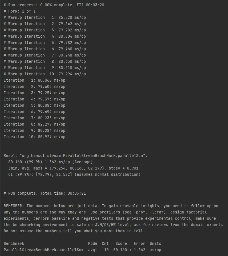 @Fork(value = 2, jvmArgs = {"-Xms4g", "-Xmx4g"})//4Gb의 힙 공간을 제공한 환경에서 두 번 벤치마크 수행