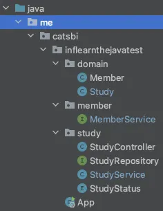 지금 진행중인 프로젝트에서 제공하는 패키지구조는 크게 domain, member, study 로 나눠져있다.