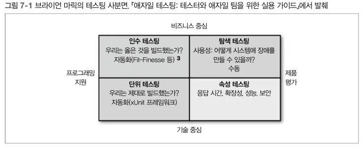 그런데 그 밖에도 속성 테스팅이나 아키텍처 테스팅등의 테스트도 존재하는데, 속성 테스팅은 이전 챕터(운영 이슈 테스트)에서 다룬 Chaos Monkey를 사용하는 응답 시간, 확장성, 예외등등 테스트가 있다.