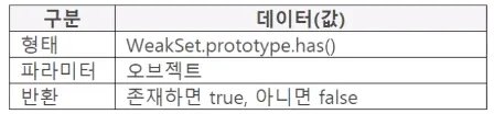WeakSet 인스턴스에서 value의 존재여부를 반환하며 있을 경우 true, 아니면 false를 반환합니다.