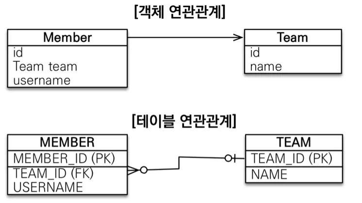 객체: Member → Team 은 member.getTeam()을 통해 가능, Team → Member 는 참조할 객체가 없기 때문에 불가능하다.