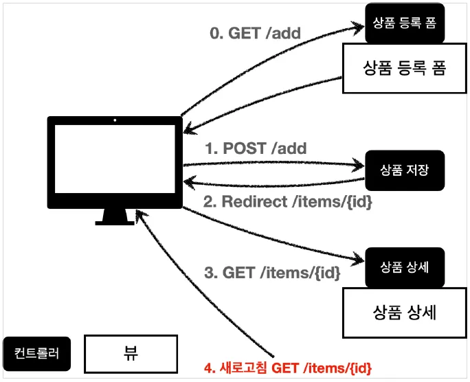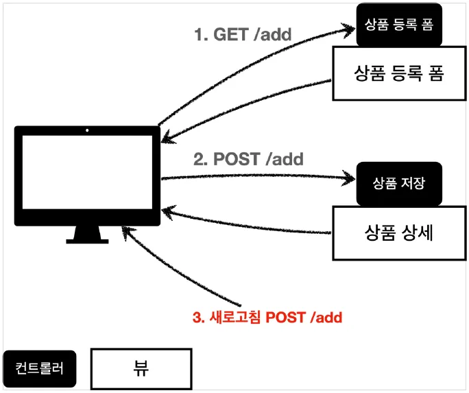 위에서 언급했듯이 웹 브라우저는 새로 고침시 마지막에 서버에 전송한 데이터를 다시 전송하는데, 상품 등록 폼에서 데이터를 입력후 저장을 선택하면 POST /add + 상품 데이터를 서버로 전송하게되는데, 이 상태에서 다시 새로고침을 선택하면 마지막에 전송한 POST /add + 상품 데이터 를 서버로 재전송하게되어 중복등록이 되는 것이다.