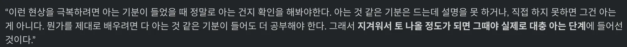 이러면 비 전문가와 대화할 때는 아는 것 많아보이고 똑똑해 보일 수 있지만, 전문가를 만나게 되면 금새 들통나 속 빈 강정임을 알리게 된다.