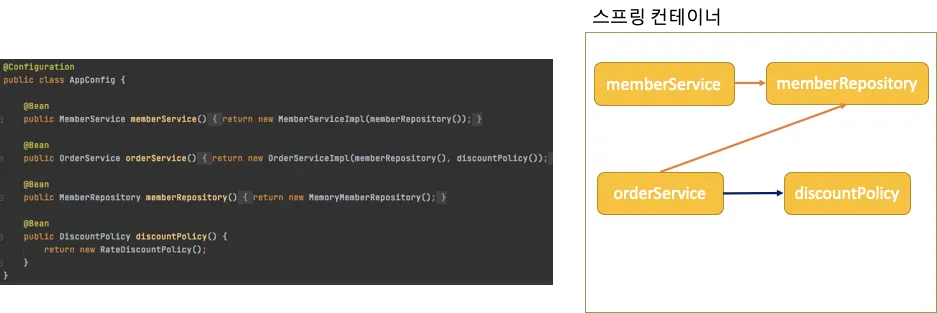 스프링 컨테이너는 위와같이 설정 정보를 참고해 의존관계를 주입(DI)해 준다.