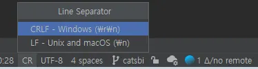 Unix & Mac은 LF이기에 생겼던 문제였다. 나같은경우 시간이 없어 우선 맥북에서 다시 작성하여 해결을 했지만, 그외에 내가 쓰는 IDE가 VS Code나 IntelliJ라면 프로그램 우측하단에서 바꿀 수 있으니 이를 확인하자.