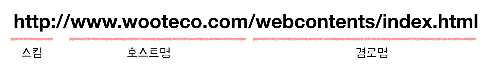 ⇒ 호스트명에서 지정된 컴퓨터상의 리소스의 위치를 나타냅니다. 위 이미지에서 경로명은 wooteco.com이라는 호스트 컴퓨터의 webcontents안의 index.html파일을 나타냅니다.