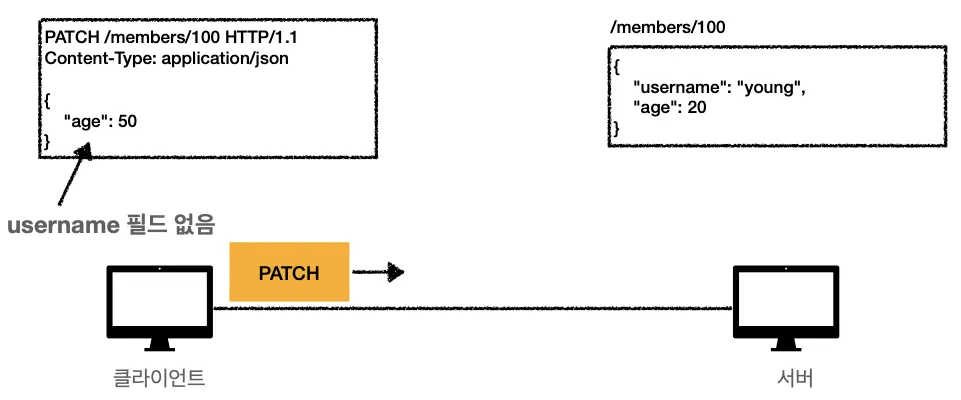 PUT과 보내는 양식은 비슷하지만, 서버에서는 PATCH로 전송된 경우 대치가 아닌 필요한 부분만 업데이트 해주는 방식으로 해야한다.