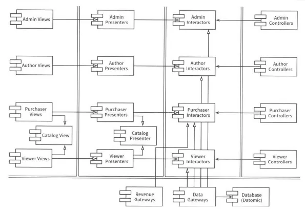 뷰(View), 프레젠터(Presenter), 인터랙터(Interactor), 컨트롤러(Controller) 로 분리된 전형적인 분할 방법을 확인할 수 있다. 또한 대응하는 액터에 따라 카테고리를 분리했다는 사실도 확인할 수 있다. 위 그림에서 각 컴포넌트는 단일 jar 파일 또는 단일 dll 파일에 해당하며 각각 자신에게 할당된 뷰,프레젠터,인터랙터,컨트롤러를 포함한다.