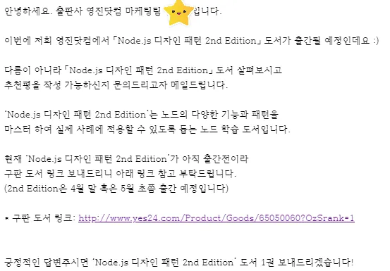 4월 말쯤에 출판사에서 연락이 왔었다. 내용은 새로나올 노드기반 디자인패턴 책 추천평 작성이 가능하냐는 것이였고, 고민하다가 이것도 경험이겠다 싶고, 책 욕심도 생겨서 수락을 했었다. 그러곤 잊고 있었는데, 몇일전 택배로 책을 받게 되었다.
