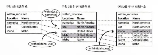 다음은 어떤 지역이 어느 다른 지역 내에 속하는지 가리키는 간선을 반복적으로 따라가는 방식으로 DB에 포함된 북미 지역의 모든 위치 목록을 만드는 예제로 이런 알고리즘을 이형적 폐쇄(transitive closure)라 한다.