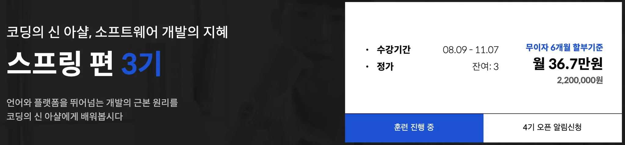 인프런으로 김영한님의 강의를 통해 혼자 조금씩 스프링을 공부하고 있었는데, 나는 제한된 시간내에 최대한의 성과를 얻어야하고 그렇기에 원래는 F-LAB을 알아보고 있었다. 6개월의 550만원이던 시절에 생각을 했는데, 한달사이에 700만원을 훌쩍 넘기도록 가격이 오르는 것을 보고, 깔끔하게 포기한 시점에서 종종 보던 유튜버이였던 아샬님이 생각이 났고, 8월 - 11월까지 진행하는 스프링 과정 3기를 수강하게 되었다.