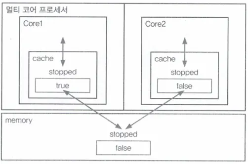 그러다보니 위 그림처럼 코어의 캐시에 저장된 값과 메모리에 저장된 값이 불일치하는 경우가 생길 수 있다.