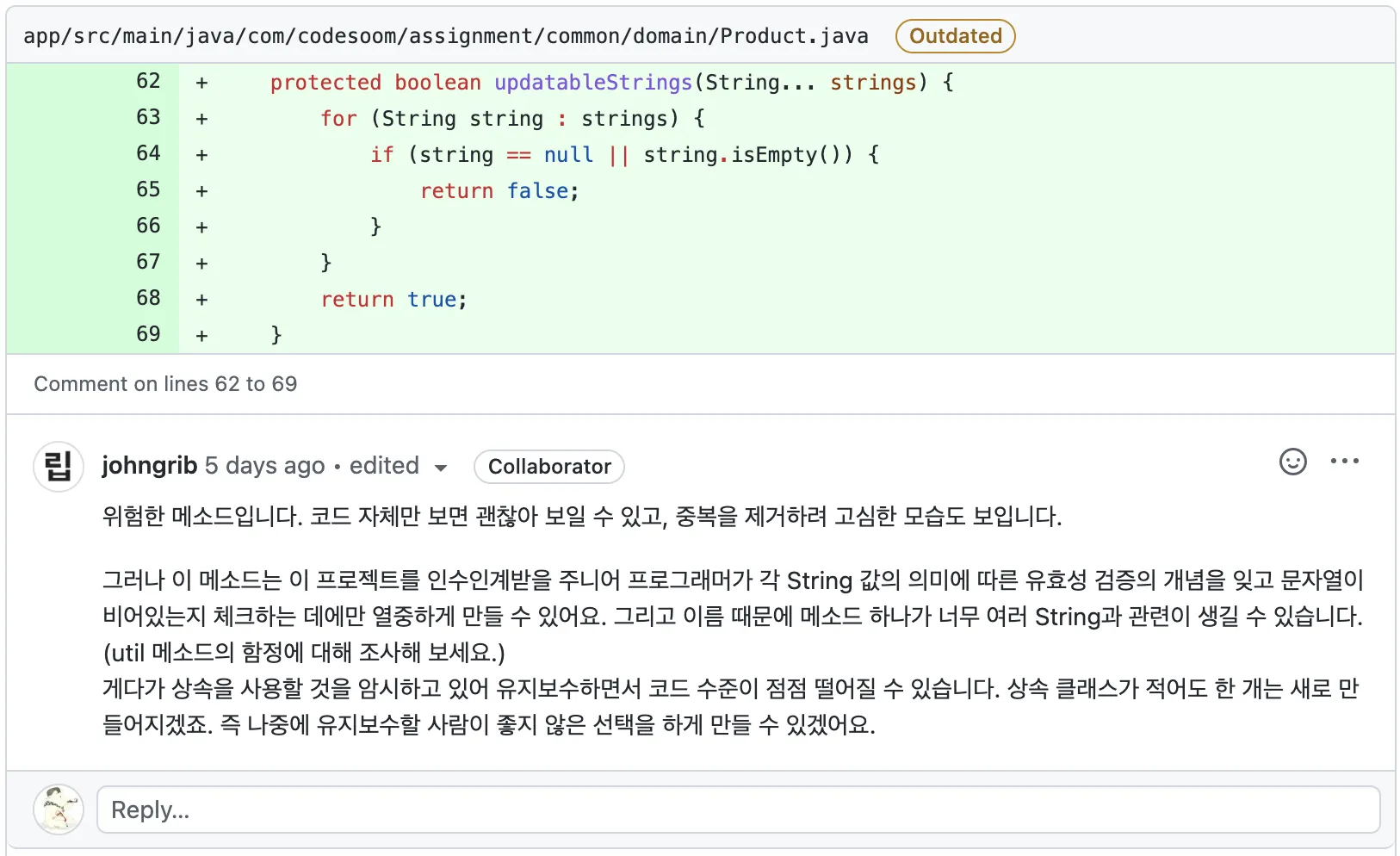 리뷰 내용처럼 얼핏 보면 하나의 메서드에서 Rest Parameter를 받아서 이를 반복문으로 순회하며 유효성 검증을 해주는데, 간결해보인다. 하지만, 이 메서드는 모든 String 타입의 필드와 연관이 생길수도 있고, 몇몇 특정 String 필드가 기획의 변경으로 다른 유효성을 검증하게 될 때 이런 특정 필드를 찾아서 변경해주는 과정에서 문제가 생길 수 있다.