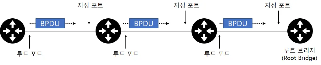 자신을 전체 네트워크의 대표 스위치로 적은 BPDU를 옆 스위치로 전달