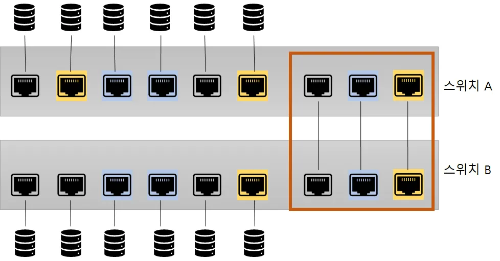 이 상황에서 스위치를 서로 연결해야 하는 경우 각 VLAN끼리 통신하려면 VLAN 갯수만큼 포트를 연결해야 한다. VLAN으로 분할된 스위치는 물리적인 별도의 스위치처럼 취급된다.