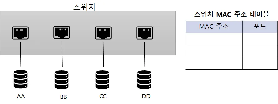 스위치가 제 역할을 수행하기 위해서는 MAC 주소 테이블을 만들 필요가 있다.