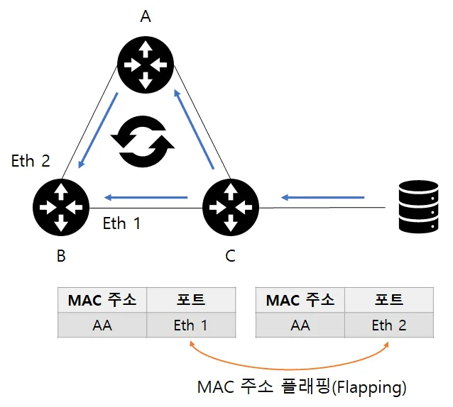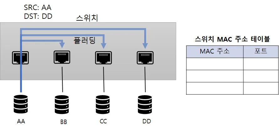 MAC 주소 테이블이 비어있는 경우 모든 포트로 패킷을 보낸다(Flooding)