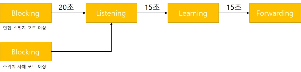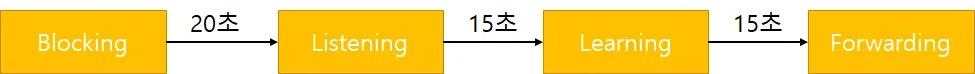 STP(Spanning Tree Protocol)을 활성화한 스위치의 상태 변화는 4단계(Blocking, Listening, Learning, Forwarding)로 새로운 스위치가 포워딩 상태가 될 때까지 30~50초가 소요된다.