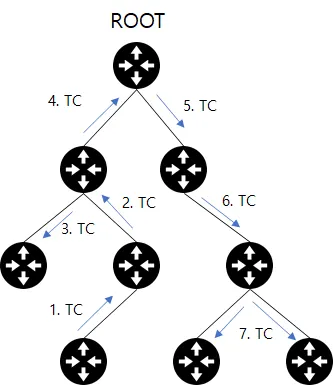 토폴로지 변경시 말단 스위치부터 루트까지 올라갔다가 다시 재연산 후 다시 말단 스위치까지 보내는 과정을 매번 하는것은 모든 스위치까지 전파되는 예비시간도 고려해야 하기 때문에 정보를 확정하는데 시간이 오래걸린다.