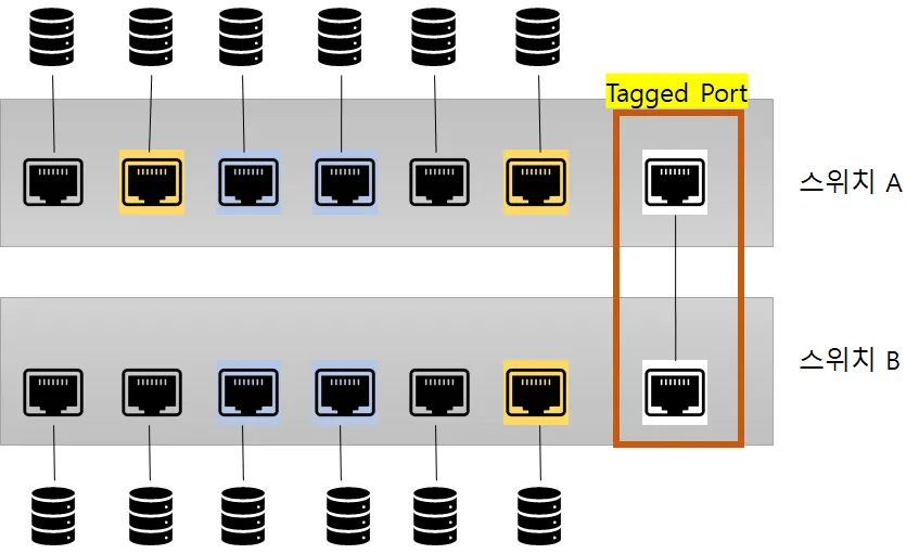 VLAN 태그 기능을 이용해 하나의 태그 포트(Tagged Port)로 여러 VLAN으로 전송이 가능하다.