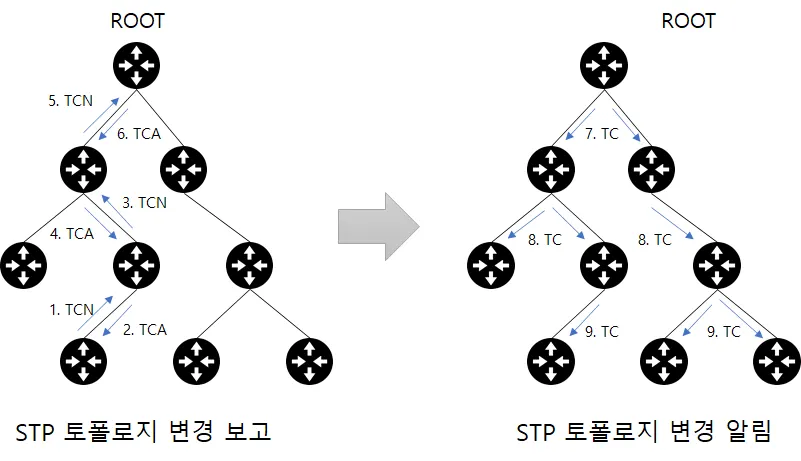 다음 그림은 기존 STP에서 말단 스위치가 토폴로지 변경이 발생했을 경우 어떻게 루트 브릿지까지 변경보고를 보내고 루트에서 연산 이후 변경된 토폴로지 정보를 알리는 과정이다.