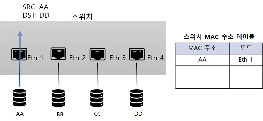 테이블에 없는 도착지 주소를 가진 패킷이 들어오면 스위치는 전체 포트로 패킷을 전송한다.