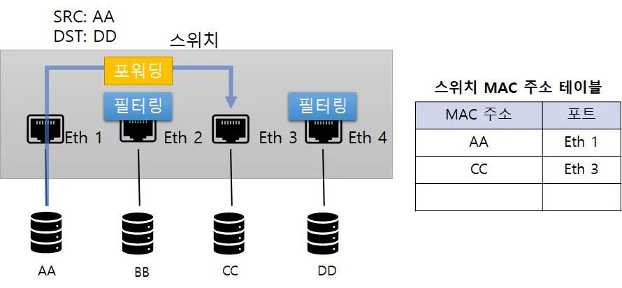 포워딩(Forwarding): 패킷이 스위치에 들어왔을 때 도착지 MAC 주소를 확인 후 MAC 테이블과 비교해 맞는 정보가 있으면 해당 포트로 패킷을 넘겨주는 것.
