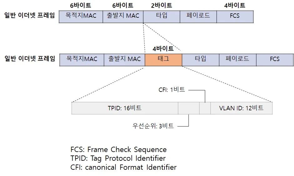 VLAN 태그 기능을 사용하기 위해 일반 이더넷 프레임 중간에 VLAN ID를 끼워넣어 전송한다.