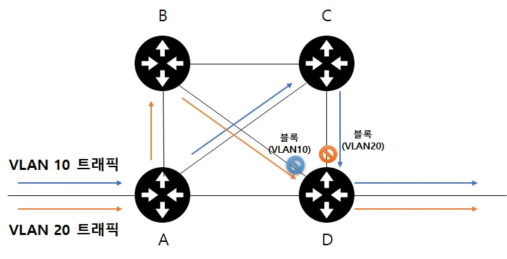 그래서 VLAN10은 A-C-D경로를 사용하고 VLAN20은 A-B-D 경로를 사용할 수 있게 해주는 것이다.