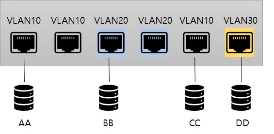 :과거 VLAN 도입 초기시점에는 스위치가 고가의 장비였기에 하나의 스위치를 분할해 여러 네트워크에서 사용하는게 VLAN을 적용하는 목적이였다. 그리고 이처럼 위치를 논리적으로 분할해 사용하는 목적을 가진 VLAN을 포트 기반 VLAN(Port Based VLAN)이라 한다.