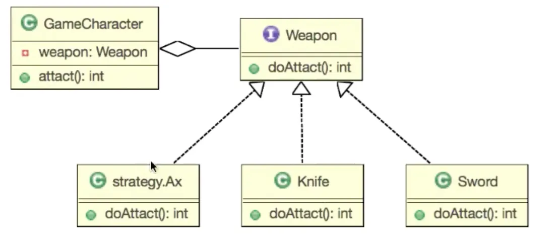 무기(Weapon)는 공격(attack)이라는 기능을 가지는 하나의 접근점(strategy)이 됩니다.