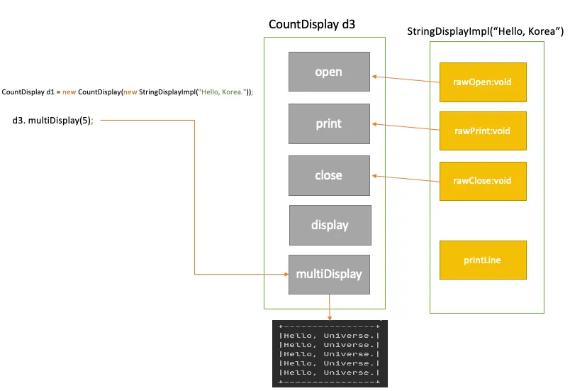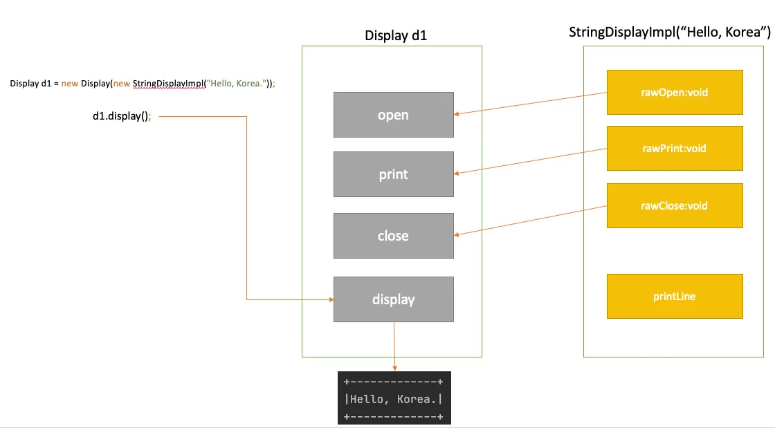 Display d1 = new Display(new StringDisplayImpl("Hello, Korea."));