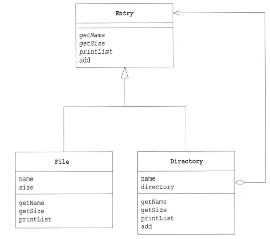 예제에서는 Entry 클래스에서 add메소드를 정의하고 예외를 제공했습니다. 실제로 add메소드는 Directory에서만 사용할 수 있기에 Directory클래스 add메소드를 오버라이딩 해서 구현해놨습니다. 이처럼 add 메소드의 설치와 구현의 방법은 여러가지가 있습니다.
