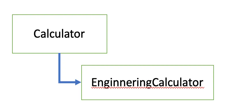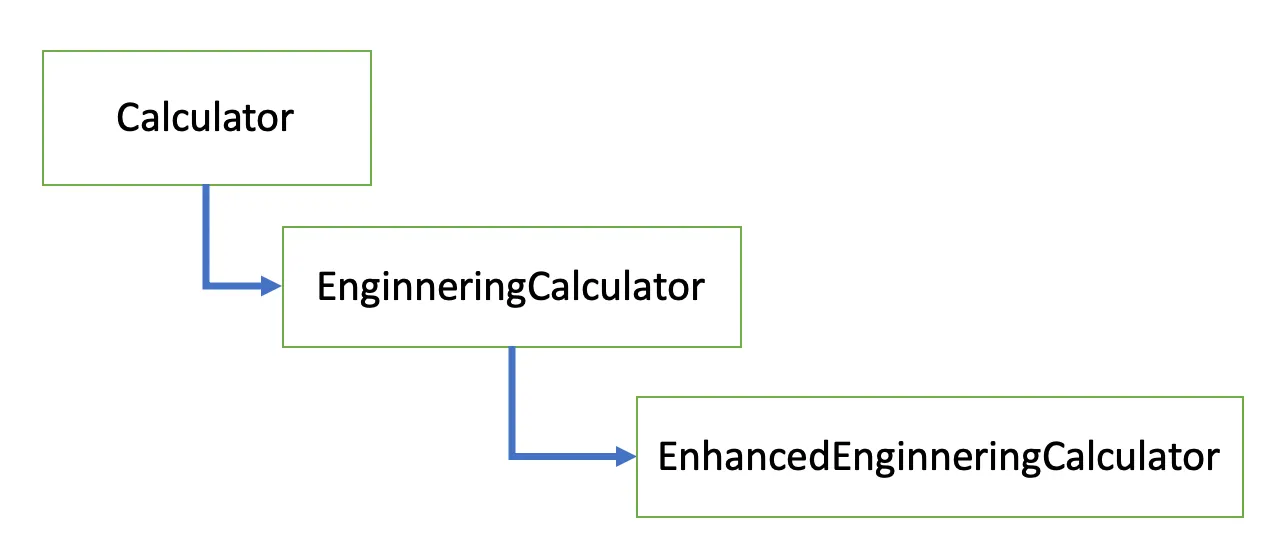 ⇒기본적인 사칙연산들을 포함하고 있는 Calculator라는 클래스가 있다고 가정합니다. 그런데 여기에 제곱,거듭제곱, 미분,적분 등 다양한 수학공식기능을 추가하고 싶을 때 우리는 Calculator를 상속받는 확장클래스 공학용계산기 EngineeringCalculator를 만듭니다. 이 클래스는 여러가지 공학용 '기능'을 추가하기 위해 만들어진 계층입니다.