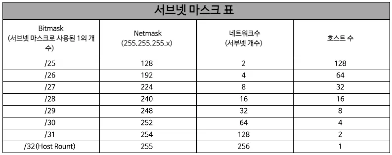 서브넷 마스크는 바로 이 서브넷을 구분하는 방법중 하나로 위 테이블을 참조해서 서브넷의 범위를 지정할 수 있다.