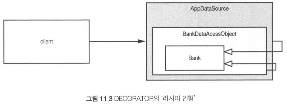 사용자(client)는 Bank의 메소드를 호출한다고 생각하지만 실제로는 Bank POJO의 기본 동작을 확장한 중첩 DECORATOR  객체 집합의 가장 외곽과 통신한다.