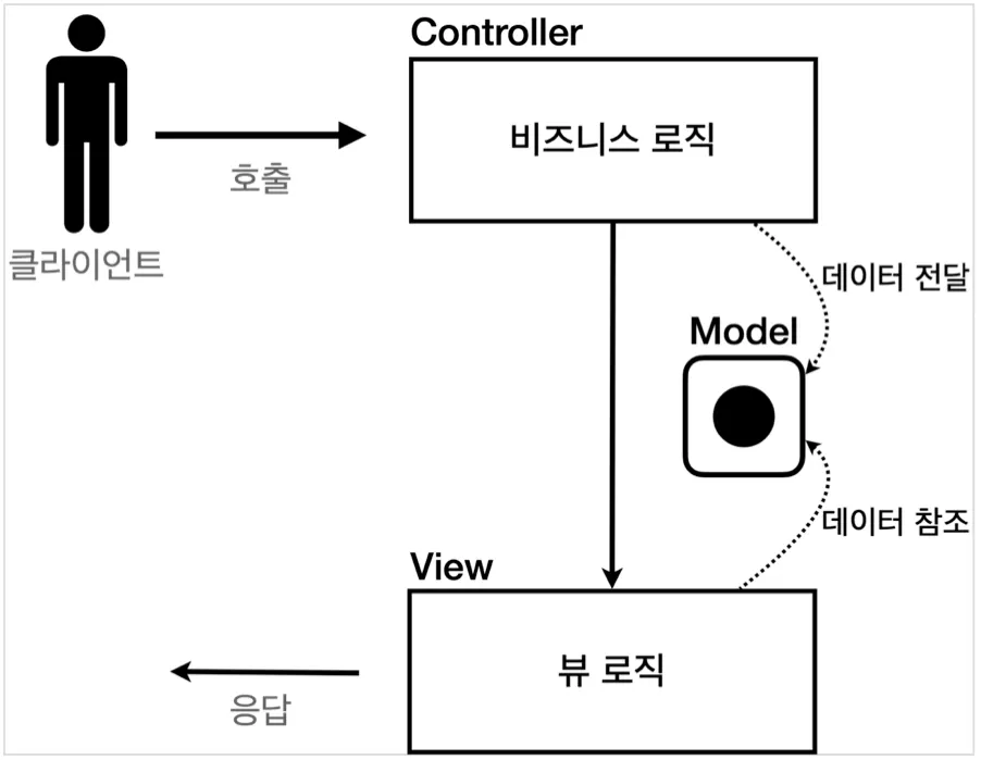 뷰: 모델에 담겨있는 데이터를 사용해 화면을 그리는일에 집중한다. 여기서는 HTML 을 생성하는 부분을 말한다.