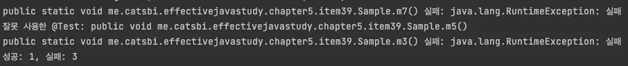 getAnnotationByType메서드는 이 둘을 구분하지 않기 때문에 반복 가능 애너테이션과 컨테이너 애너테이션을 모두 가져오지만, isAnnotationPresent 메서드는 둘을 구분하기에 이전과 같이 단순히 isAnnotationPresent로 반복 가능 애너테이션이 달렸는지 검사하면 의도와 다른 결과를 반환하다.