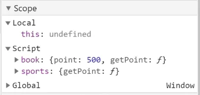 화살표 함수인 sports.getPoint()를 호출하면 Scope Local에 this:undefined가 표시됩니다.