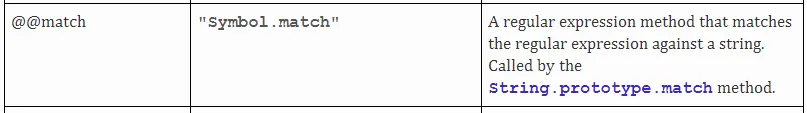 위 이미지는 ECMA Specification문서의 Well-known Symbols Table1의 @@match부분인데 코드에서 String.prototype.match가 호출되면 우선 개발자 코드에서 "Symbol.match"를 찾는데 성공한다면 해당 함수를 실행합니다. 하지만, 찾지 못했을 경우 엔진에서 @@match를 실행합니다.