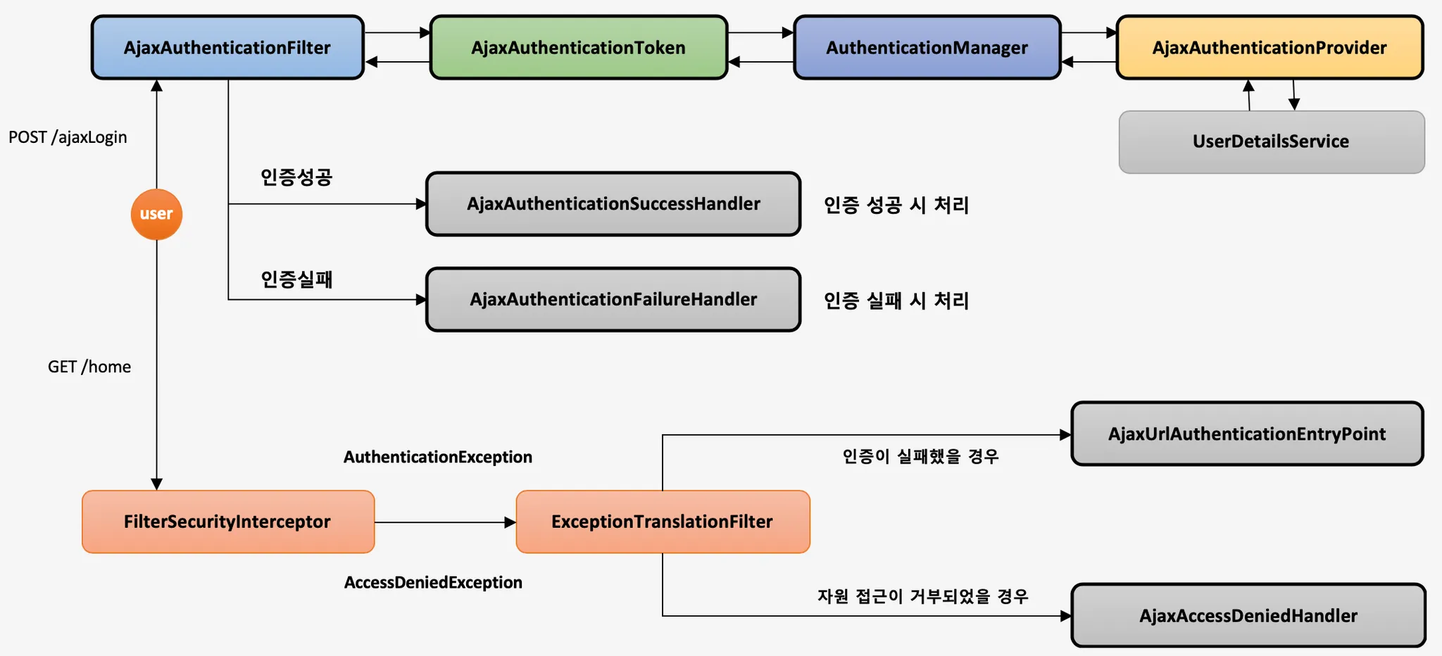 필터가 인증객체(AjaxAuthenticationToken) 에 인증처리를 하기위해 보낸정보를 담아서 인증관리자 (AuthenticationManager)에게 인증객체를 전달해주고 객체를 전달받은 매니저는 실질적으로 인증처리를 담당하는 AjaxAuthenticationProvider에게 인증처리를 위임하게 됩니다.
