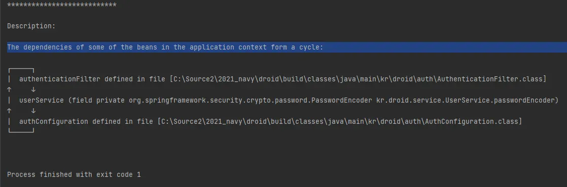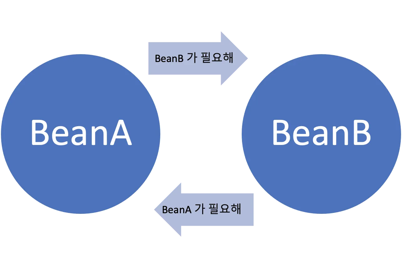 애플리케이션을 구동하면 이제 스프링 컨테이너(IOC)는 BeanA 빈을 생성하기위해 BeanB를 주입해줘야하기 때문에 BeanB를 찾을 것이다. 근데 BeanB를 생성하려 하니 BeanA가 필요해서 BeanA를 주입하기위해 BeanA를 찾게되면서 무한 반복이 생기게 된다.