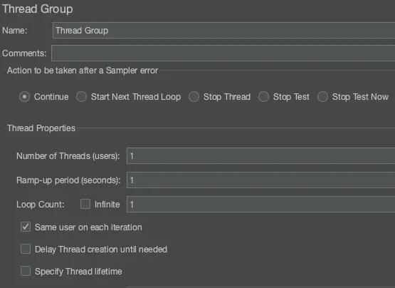 Thread Group: 한 쓰레드에 유저 한명 즉, 유저의 그룹으로 동시에 여러 유저가 요청을 보내는 경우를 세팅할 수 있다.