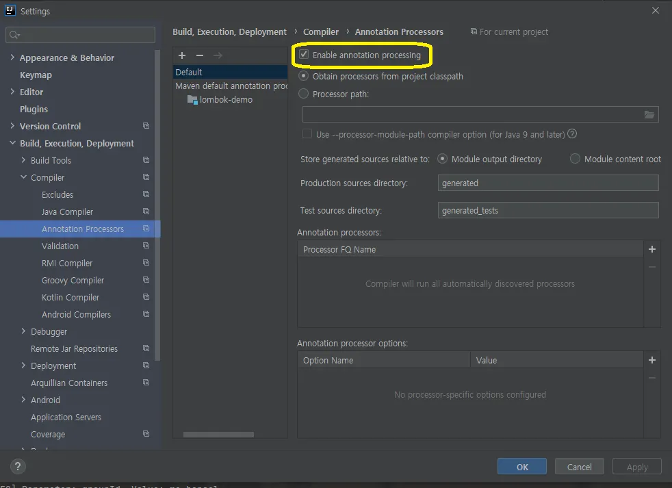 settings 에서 Annotation Proccessors 항목에서 Enable annotation processing 항목 체크